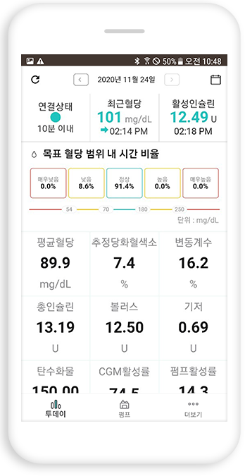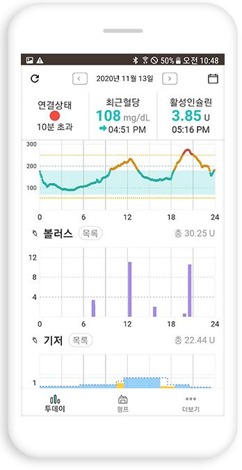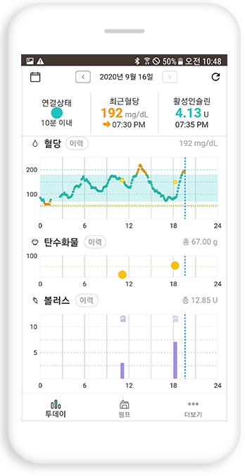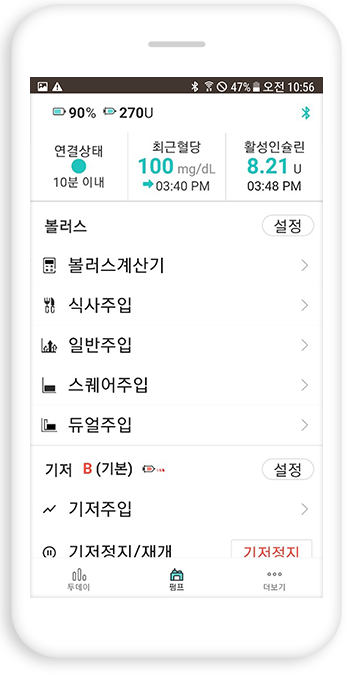 볼러스 계산기 기능을 제공하여 현재혈당 및 추세혈당을 반영한 인슐린 주입이 가능합니다.